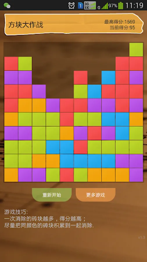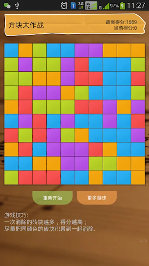 This is a play the more addictive puzzle game to eliminate the box. Together squares of the same color can be eliminated, one as much as possible to eliminate the same colored squares you can get a high score.