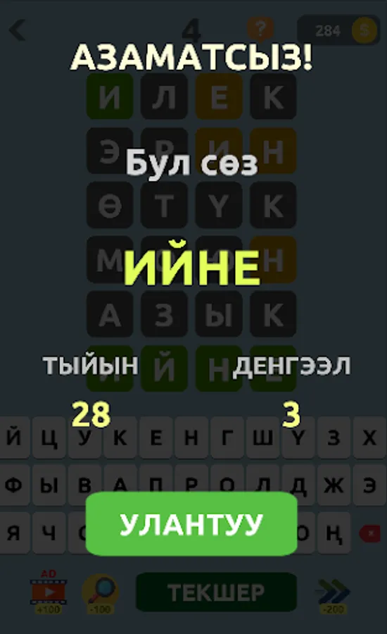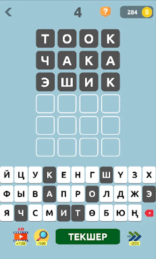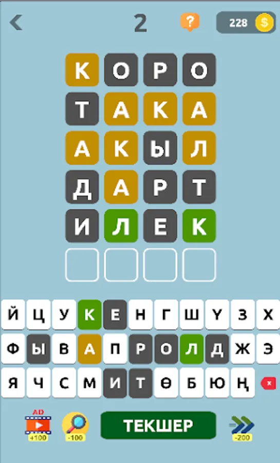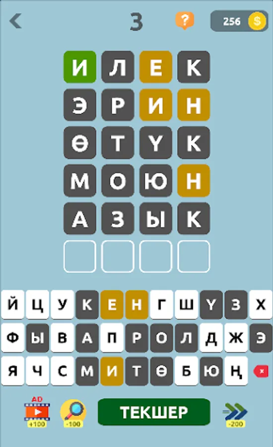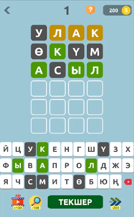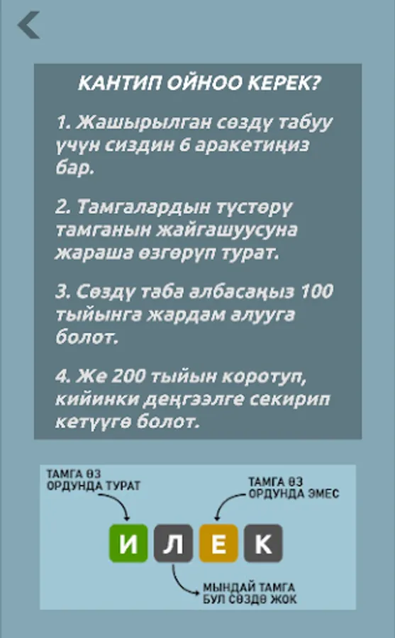 The game "Find the word" is one of the games in the Kyrgyz language. In this game you have to find the hidden word. You will have 6 chances to do so.