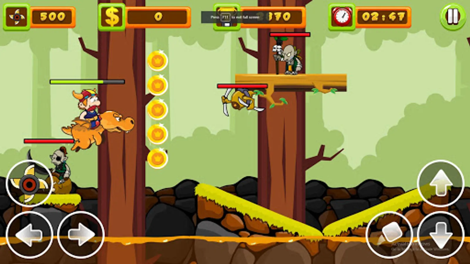 You can throw different types of weapons, and the dragon breathe a fiery flame. Help your people to survive - get out of the woods and collect as many points and ammunition as possible!