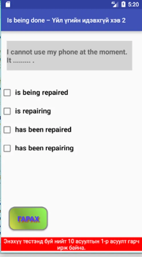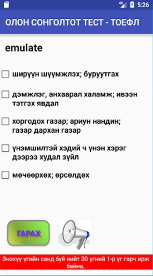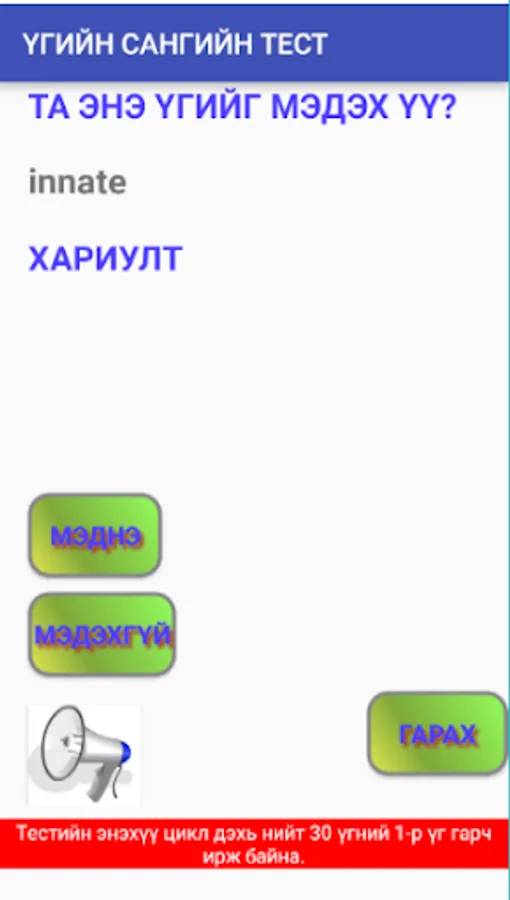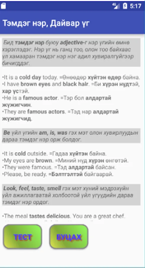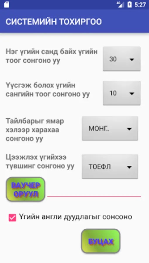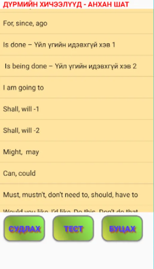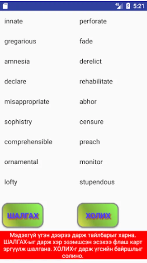 Энэхүү апп нь англи хэлний анхан шатны 2000, GRE -н шалгалтын 500, SAT-н шалгалтын 1000, мөн ТОЕФЛ-н шалгалтанд хамгийн түгээмэл хэрэглэгддэг 1350 үг, нийт 4850 үгийг зохиогчийн өвөрмөц алгоритмын дагуу богино хугацаанд таньд цээжлүүлэх болно. Мөн та 50000 үгсийн сантай англи -монгол толь хэрэглэх боломжтой боллоо. Англи хэлний анхан шатны дүрмийн 60 хичээл, 60 тест нэмэгдлээ. Ямар ч ad байхгүй, төлбөргүй, зөвхөн таны англи хэлний боловсролд зориулагдсан болно.