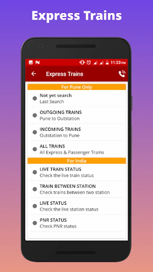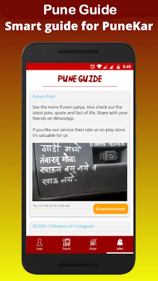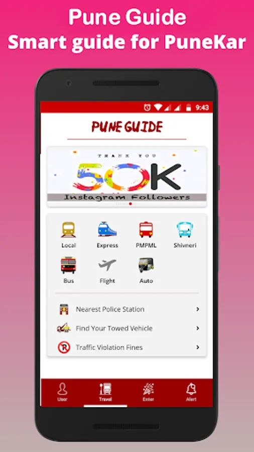 Pune's first All-in-One App : Get the Pune Local trains, PMPML Bus, MSRTC, Shivneri Bus, Express Trains times and schedule, Auto, Flights, Traffic rules & fines, Jobs, Nataks, News, Movies, Festival, Alerts, Emergency contact numbers, Picnic places, College list, Street Food around Pune city for Punekar & PCMCkar Peoples.