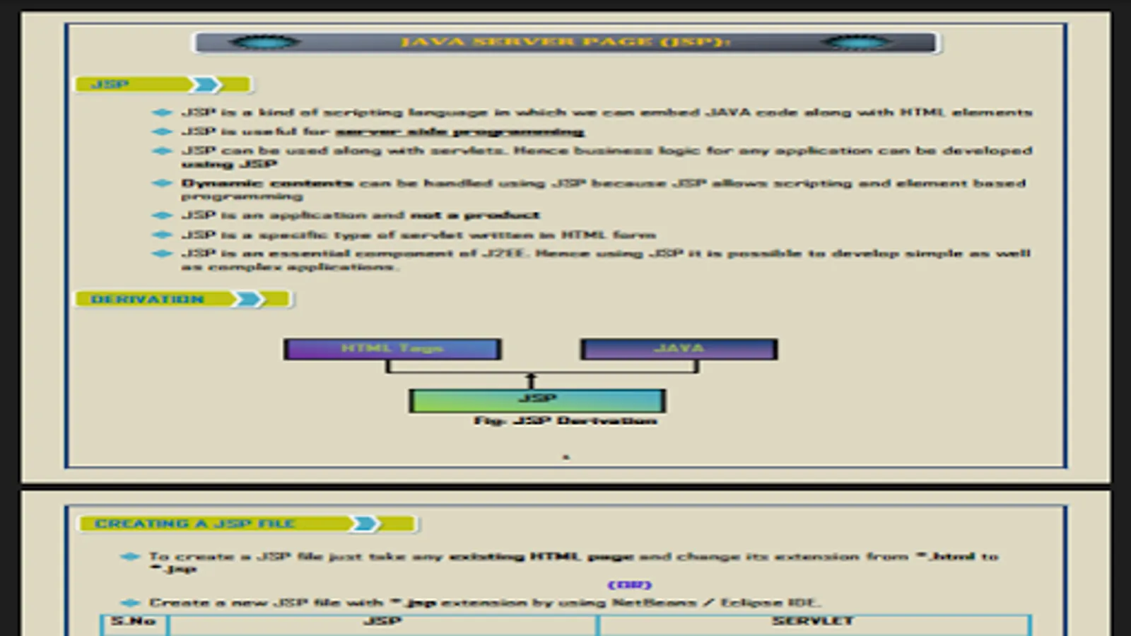 Tangy Red+ Dazzling Blue= Royal Purple Colour, the King of All ! Likely Java + HTML=JSP. JSP –JAVA SERVER PAGES constitutes server-side programming technology that enables the creation of dynamic, platform-independent method for building Web-based applications.