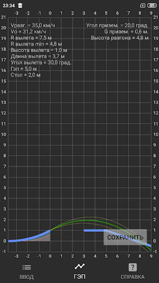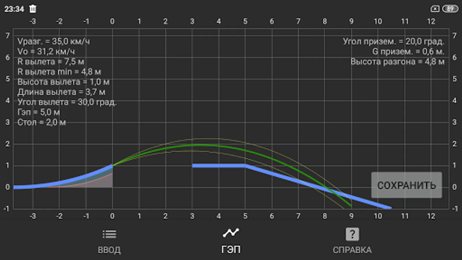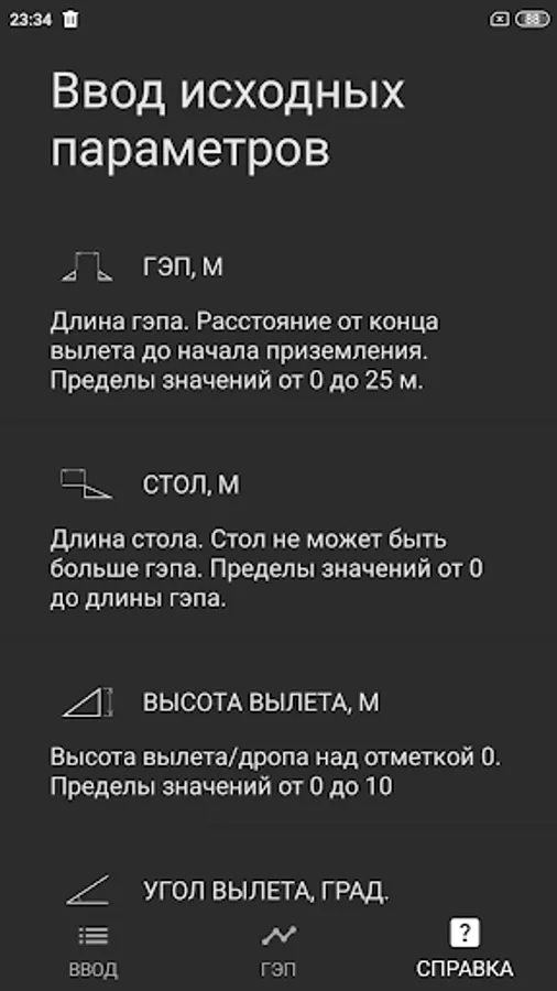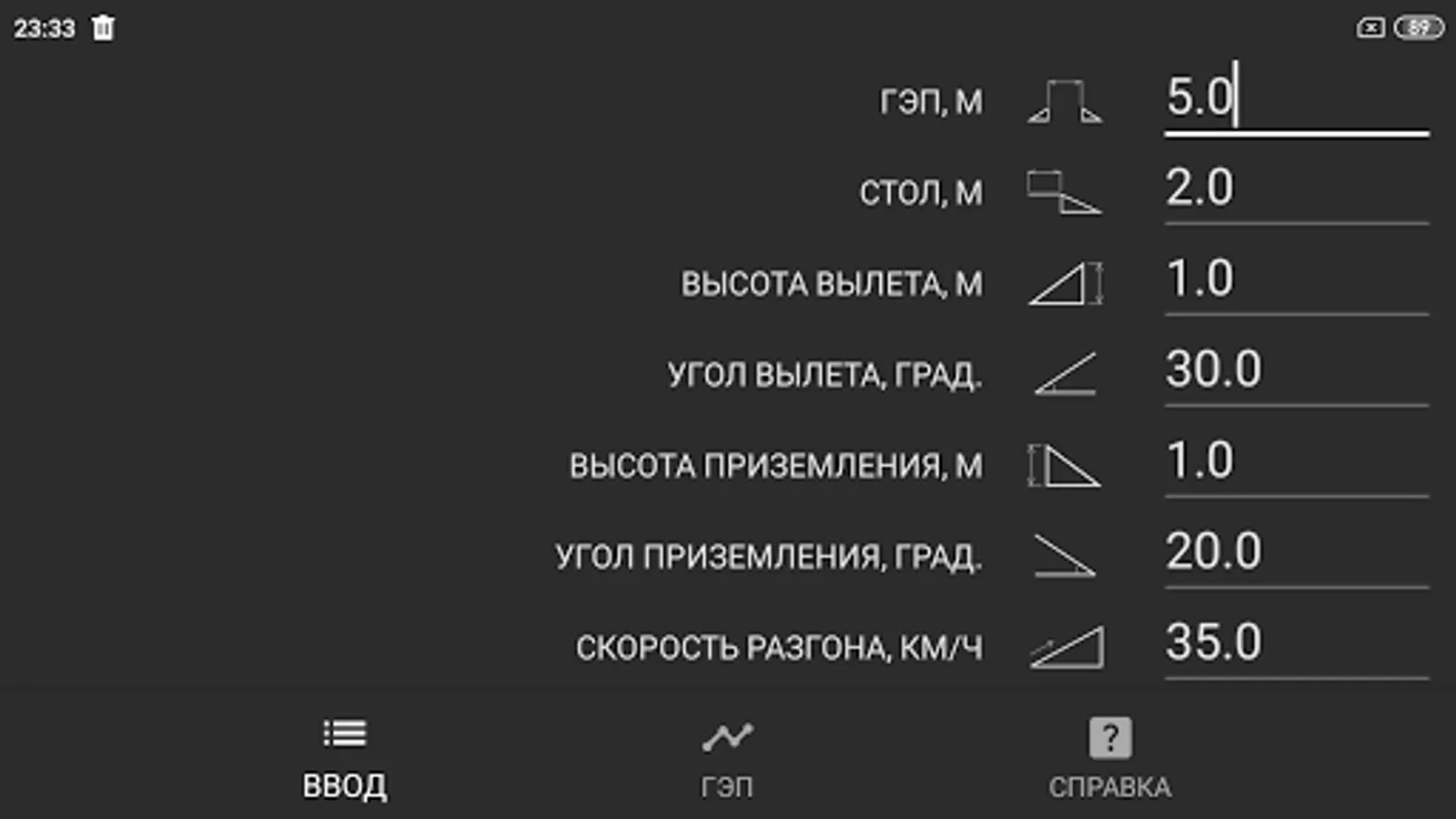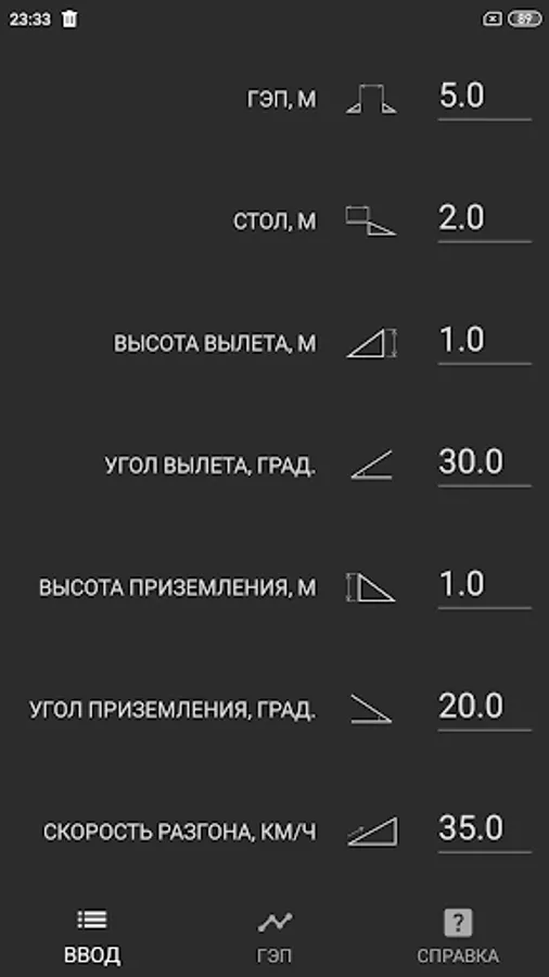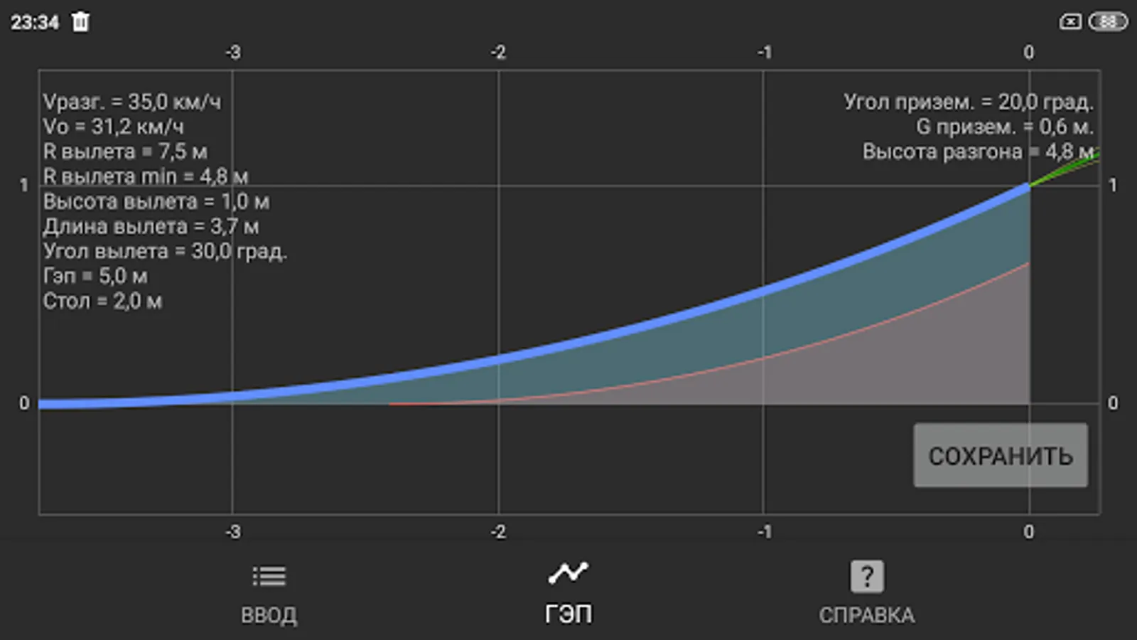The application is intended for preliminary calculation of the springboard and a rough estimate of "flight" / "underflight" before landing.
