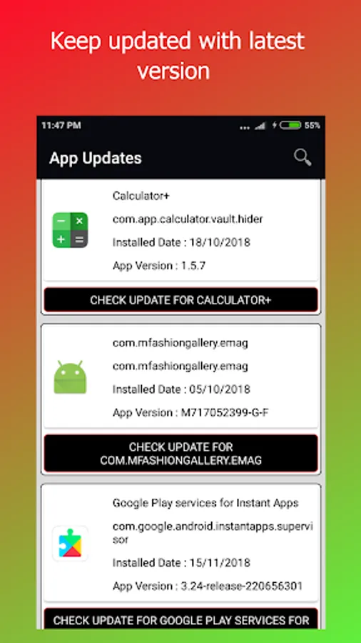 ✔ Scan And Track through the list of all the application/software in your device to find out which application needs to be updated as per its version on Google Play Store.