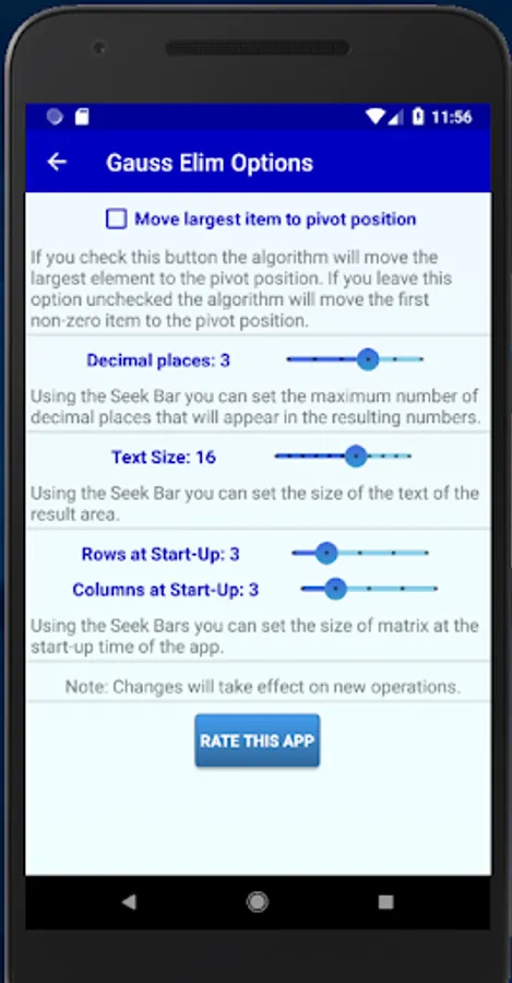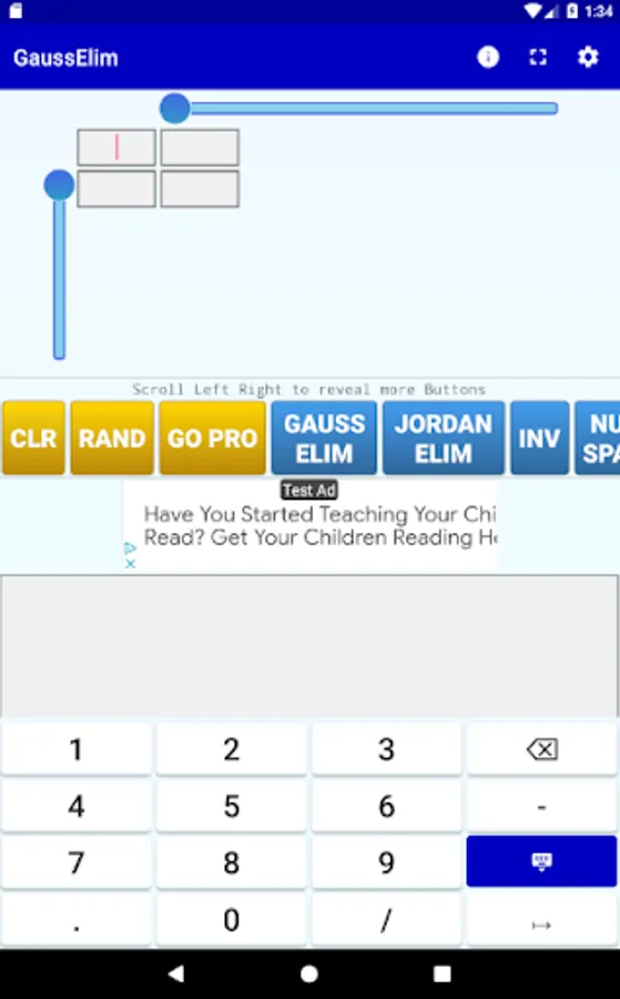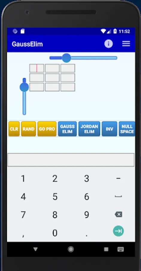 GaussElim is a simple application that applies the Gaussian Elimination process to a given matrix. You can set the matrix dimensions using the scrollbars and then you can edit the matrix elements by typing in each cell (the cells become active/inactive once you move the respective scrollbar). You can move to another cell either by pressing the NEXT key on the soft keyboard, or by tapping the desired cell.