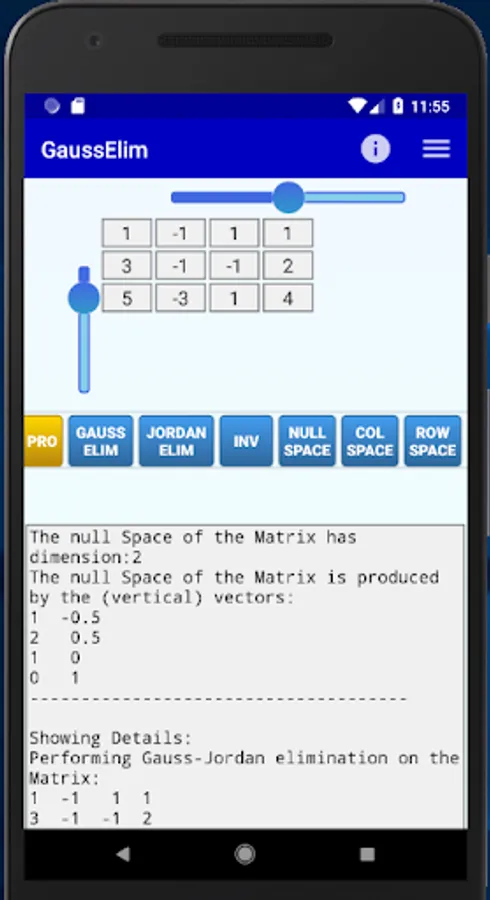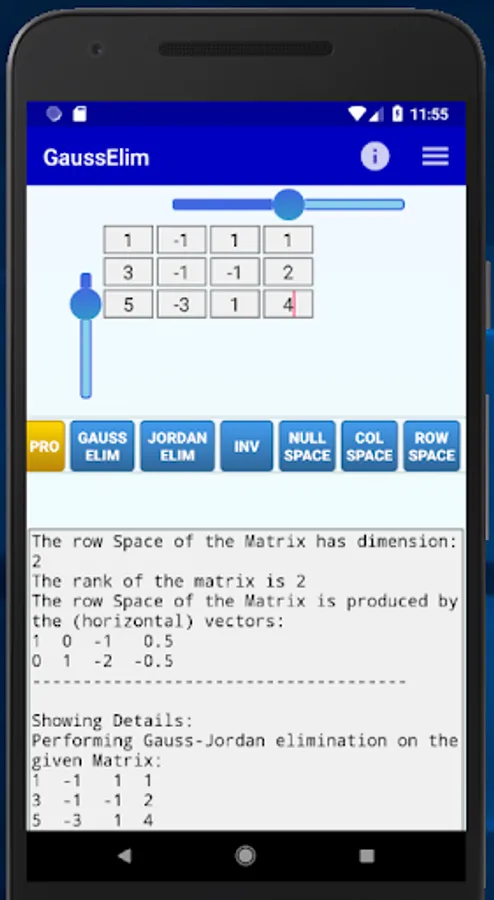 After you have entered the entries of the desired matrix, you can press one of the available buttons and see the result (and detailed explanation) on the bottom of the screen: