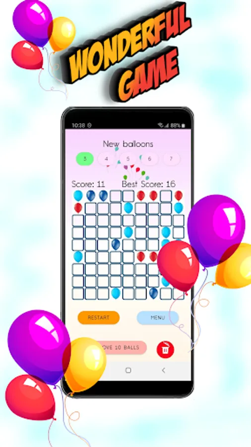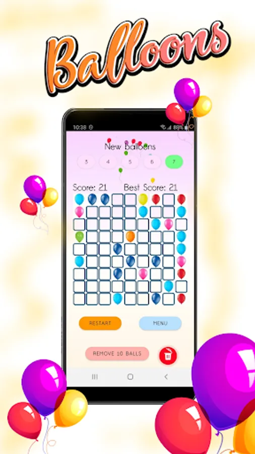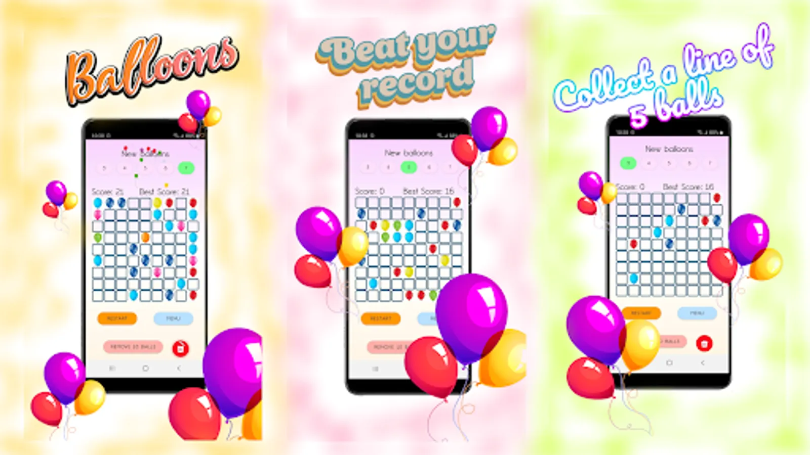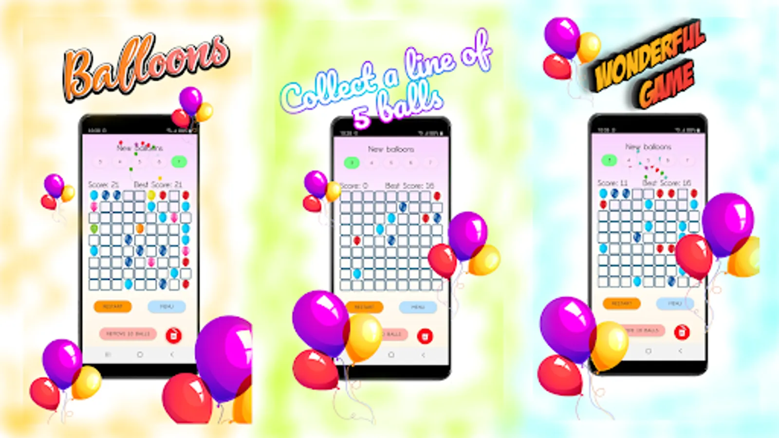 This is an exciting game! You can change the difficulty by increasing or decreasing the number of balls appearing. Your task is to score as many points as possible. Collect horizontal and vertical lines from balls! The balls will disappear when you collect a line of 5 or more balls. Good luck!