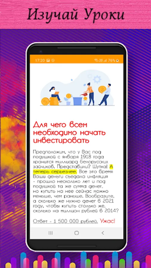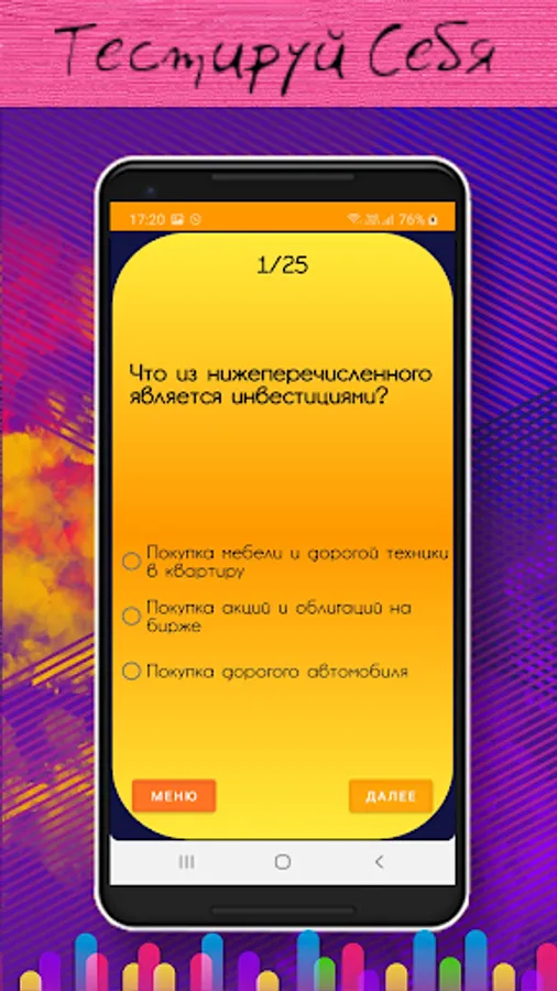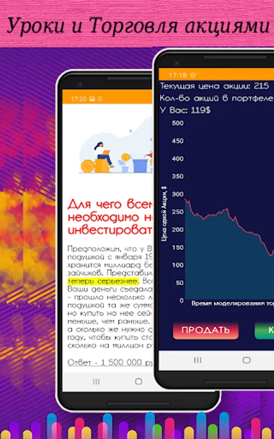 The application will allow you to get acquainted with investments. You will learn about various financial instruments. You will be able to study theoretical lessons and trade securities using our developed stock exchange simulator.