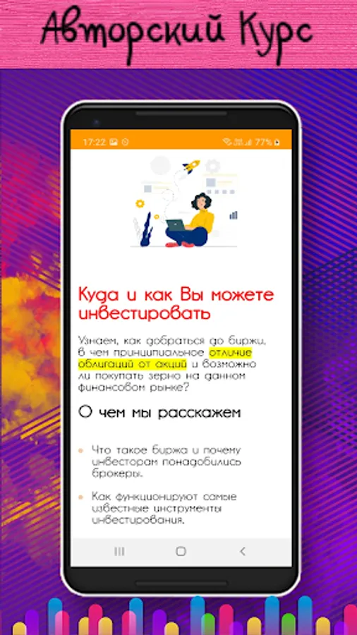 The app is constantly being updated! We are working to improve it. Already now you can take an exciting investment test, evaluate your knowledge in the field of financial literacy, start studying a theoretical course, and also use an exchange simulator. Trade shares virtually and enjoy!