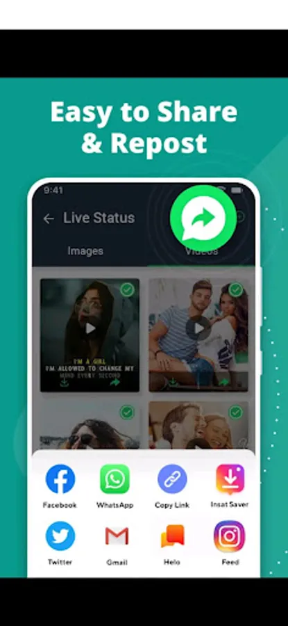 Status Saver image and video collector is a storage house for saving stories, picture, photos and new statuses that gives easiness to reuse the status in term of watching again and report on status. Best save pictures and video's status doesn't need to ask someone to send. From the statuses store, any undesired image or video can be deleted.