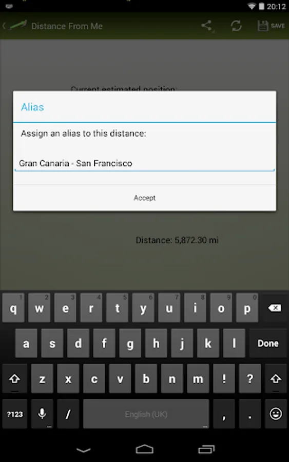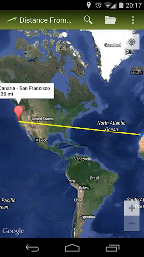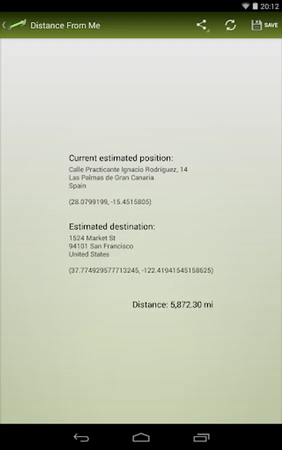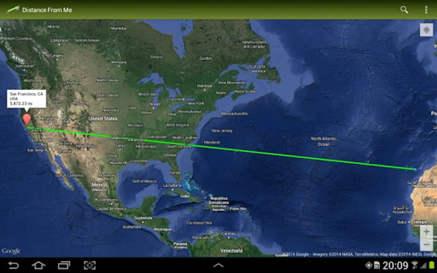 Distance From Me is an intuitive tool to calculate distances in a straight line between current position and any location (in yards or miles). You can specify the location manually, or search with the search engine (voice search is included) and share it with your friends.