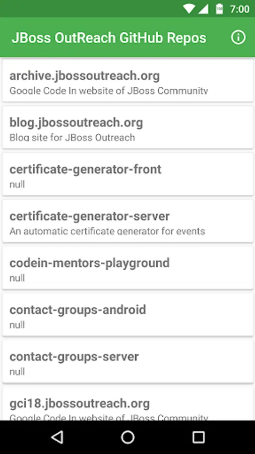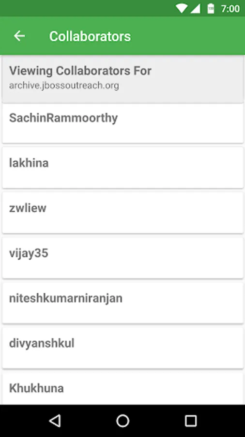A demo android app to fetch and display GitHub repositories maintained by JBoss OutReach Organistaion and also display their colaborators.