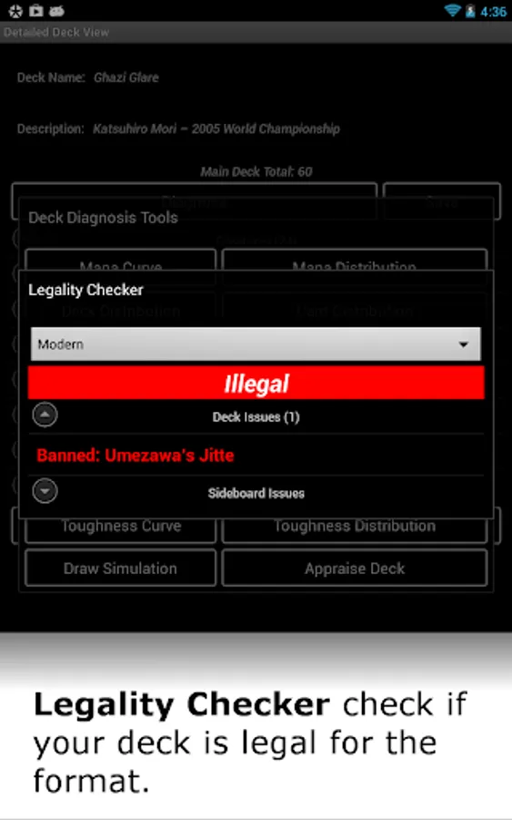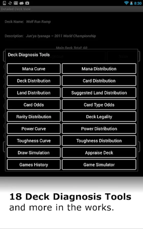 Demo of MTG Doctor, a deck building and analysis tool for Magic the Gathering (MtG) decks. This demo comes with a test deck and allows you to get the past MTG champions' decks by long pressing the 'Create New Deck' button or pressing the Menu key. To create your MTG Deck you will need the paid version.