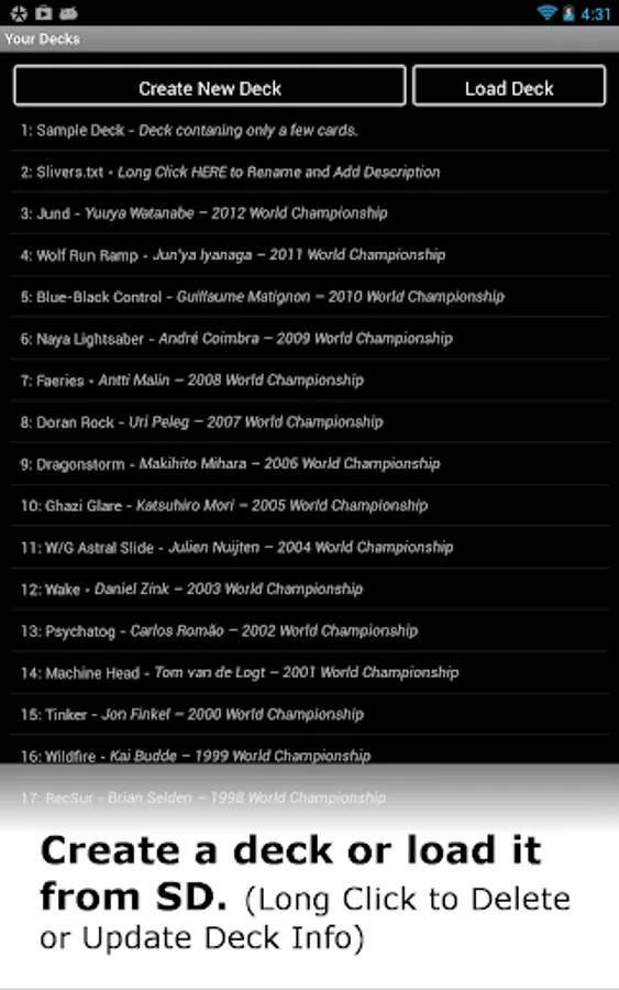 Champion Decks Loader - Press the menu key or hold the "Create Deck" button to access the Champion Deck loader.