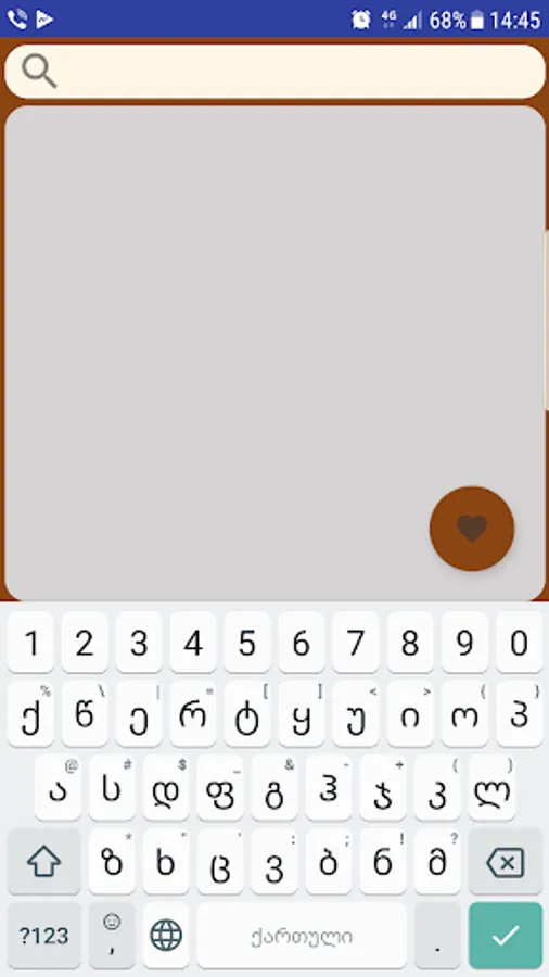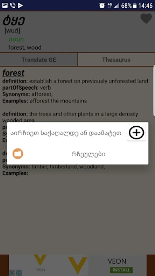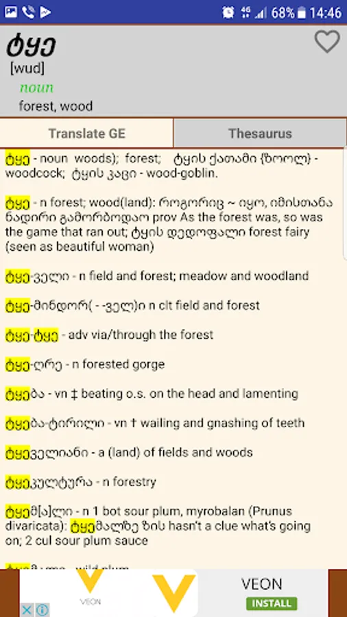 Start the app and type. The dictionary detects the entered language automatically. By clicking on the list entry, the detailed information is shown. Translations are fetched from translate.ge as well and more info from Thesaurus.
