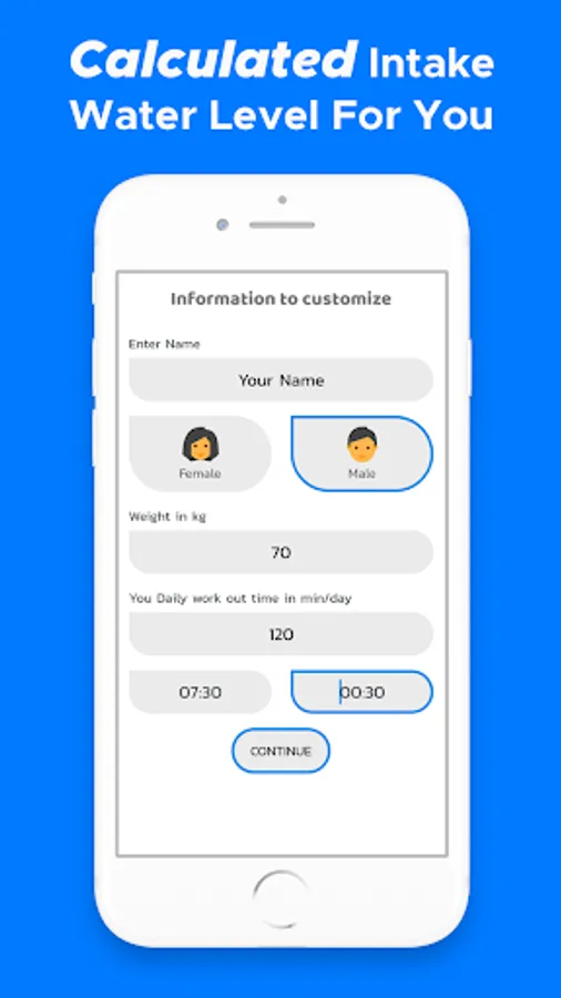 Give me your height and weight and recommended water intake level will be set for you! Tell me your awake time and water reminder warns you to drink. Before your sleep time, water tracker shows your daily water intake.