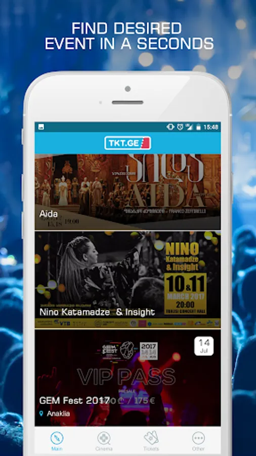 TKT.GE app is best way to find desired events in a seconds. You can see all kind of events in one place like: cinemas, theaters, sports, concerts, festivals and other events. You can also buy transport tickets.