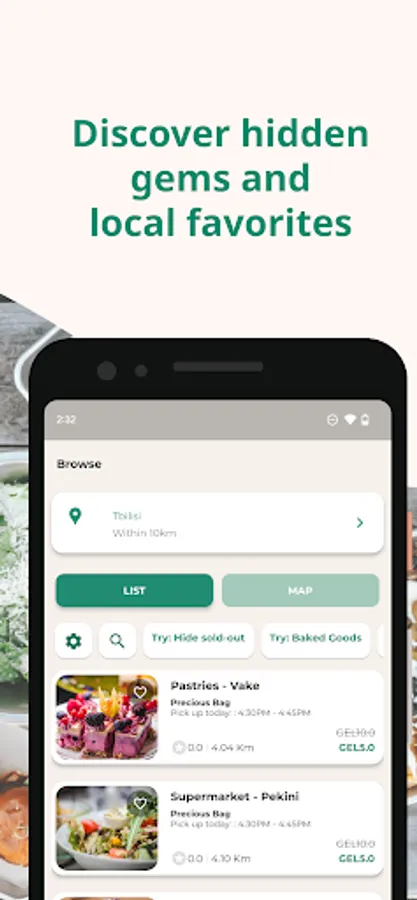 • Use the map to identify a restaurant, cafe, or store nearby that has unsold food.