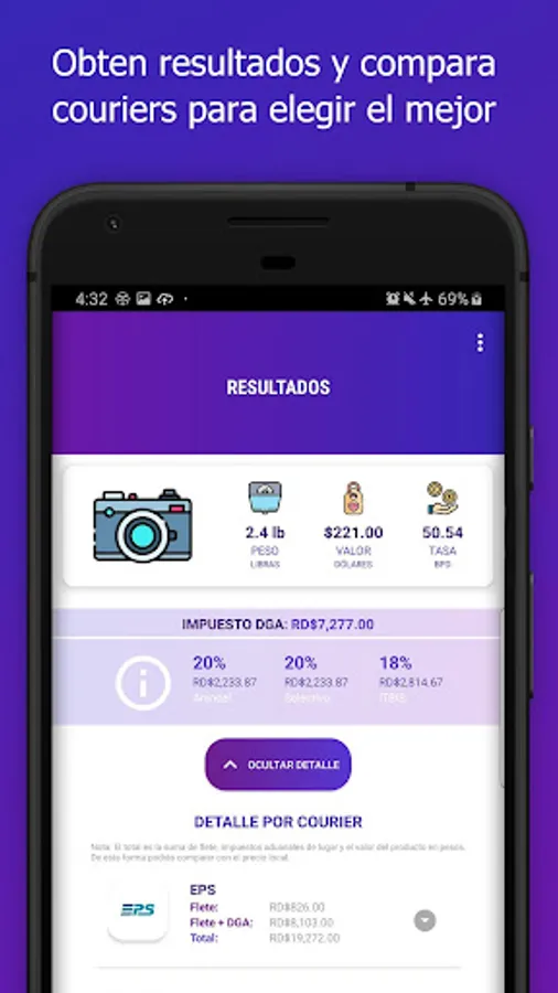 Calculate the cost of your online purchase by bringing it to the Dominican Republic. With Couriers RD you can compare the costs of bringing your item in each courier, including customs taxes over 200 dollars. You can see the final total cost, including the product, and compare if it is better to buy out or local, and by which courier. This app will help you make an economically intelligent decision.