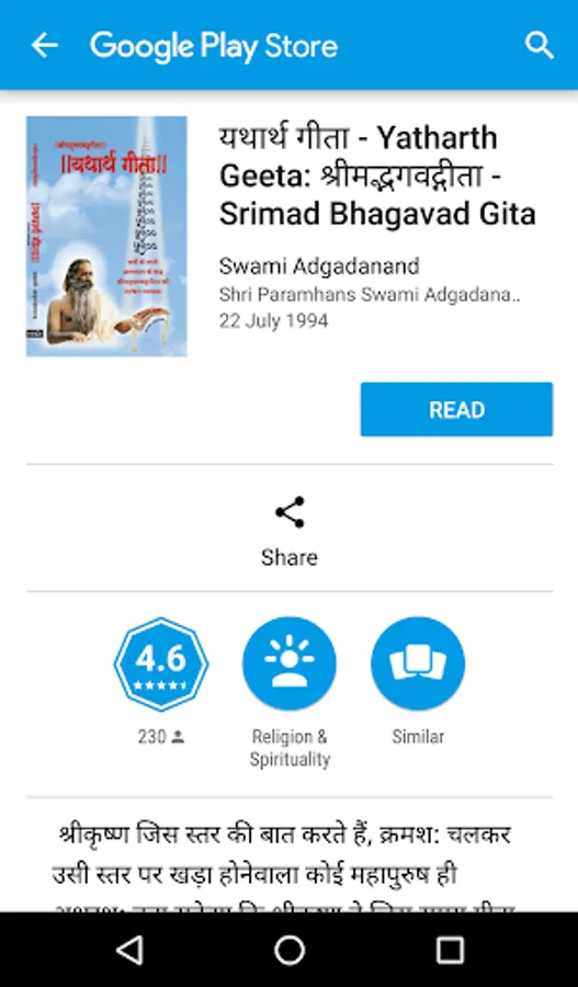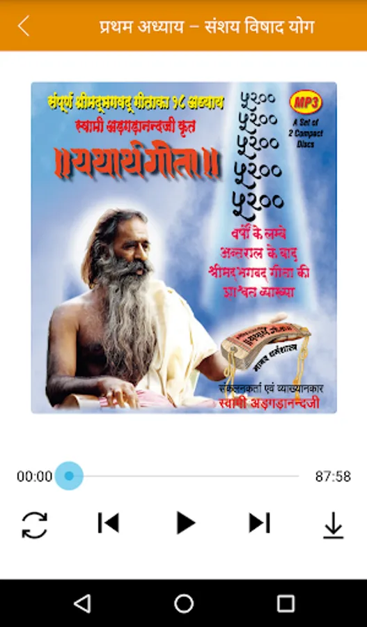 This App allows you to Listen, Read and Download MP3 and Book of Srimad Bhagavad Gita verse by verse with explanation in Hindi Language.