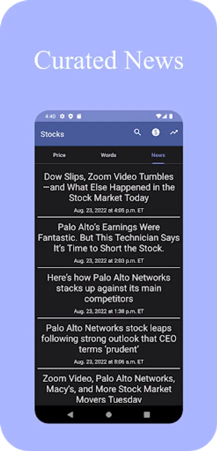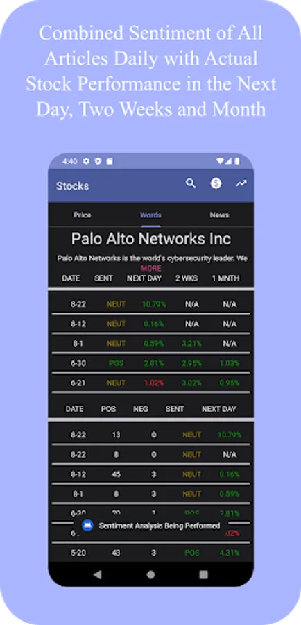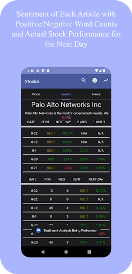 Stocks uses sentiment analysis to parse curated news articles, custom word lists to return a count of positive and negative words and a backend service that uses multivariant logistic regression with these inputs and price data to predict stock movement in the next day, two week and one month time frames.