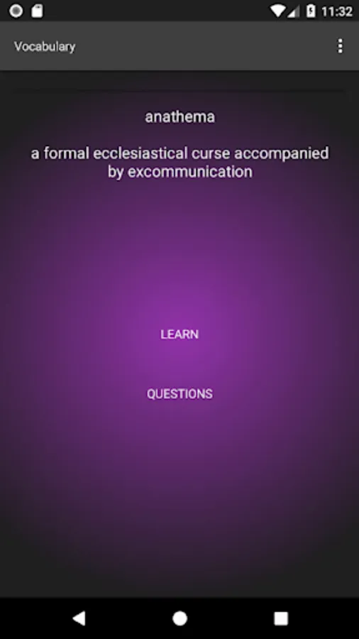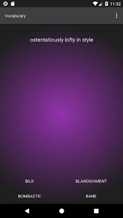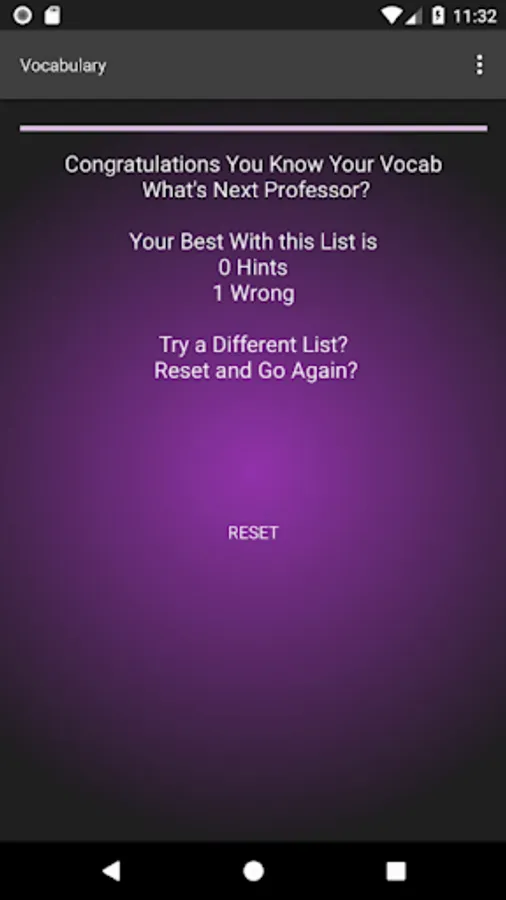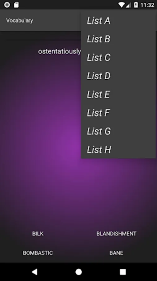 Vocabulary builder with 300+ words. Questions are given in either multiple choice or fill in the blank format. Progress is kept independently within each list and rank. After completing the rank your top score persists based on wrong answers and hints accumulated.