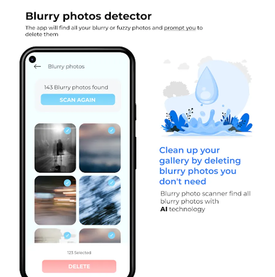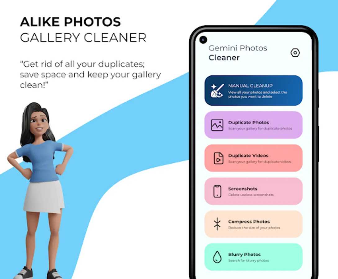 Clean your Android Gallery with just one touch. The app can clean duplicate photos, remove blurry photos and clear useless screenshots from your gallery.