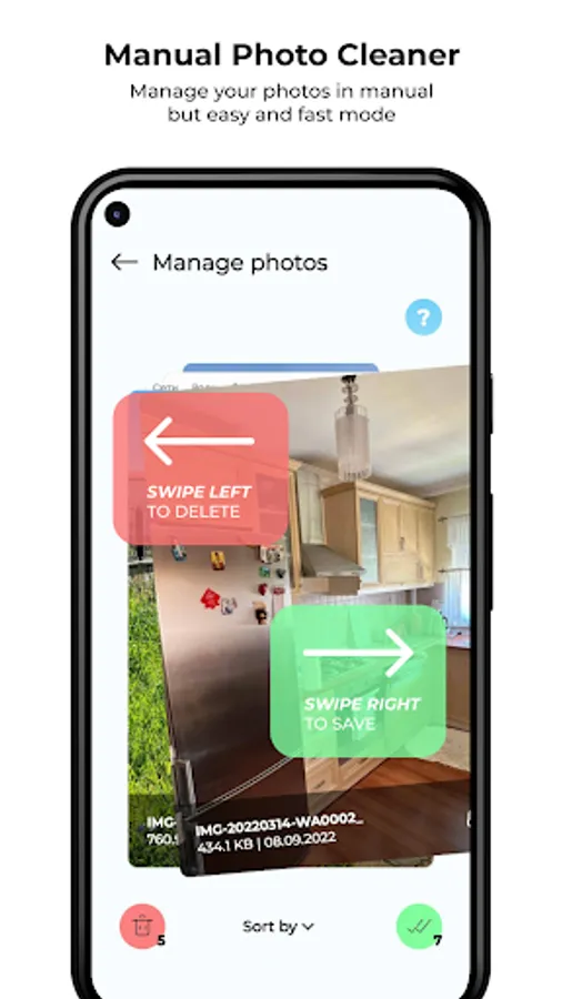 Manual Cleaner : View all your photos and swipe left to delete photos and right to save photos. This will help you clean up your gallery much easier and faster. Swipe Gallery Cleaner.