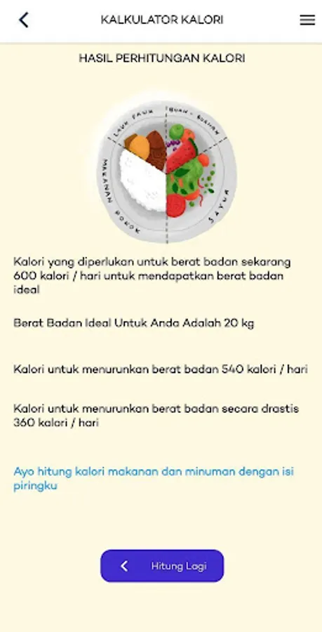 This feature contains 3 parts that can be used to calculate Body Mass Index, Calorie Needs & Daily Food Menu Composition.