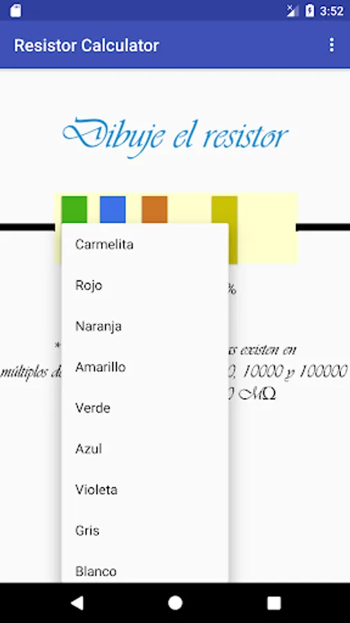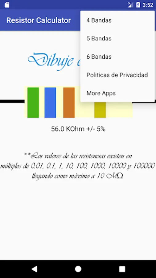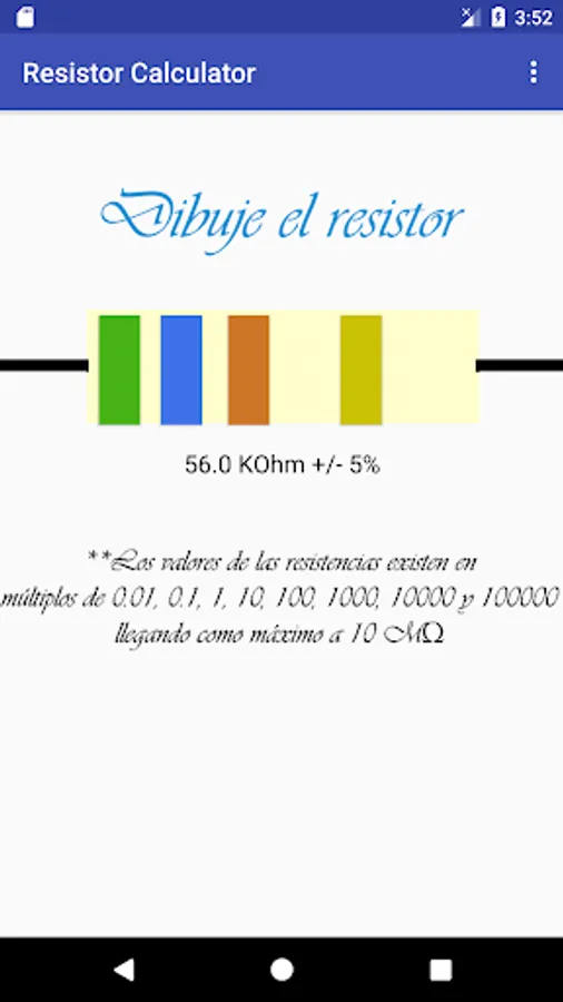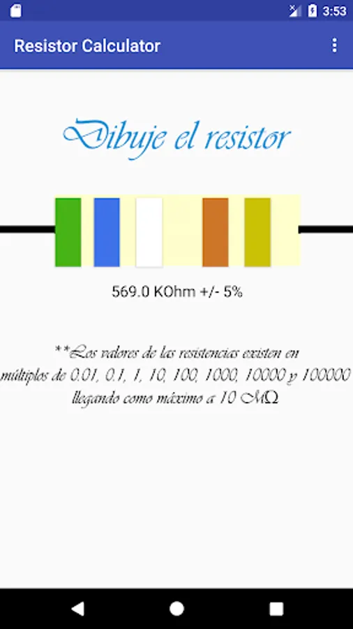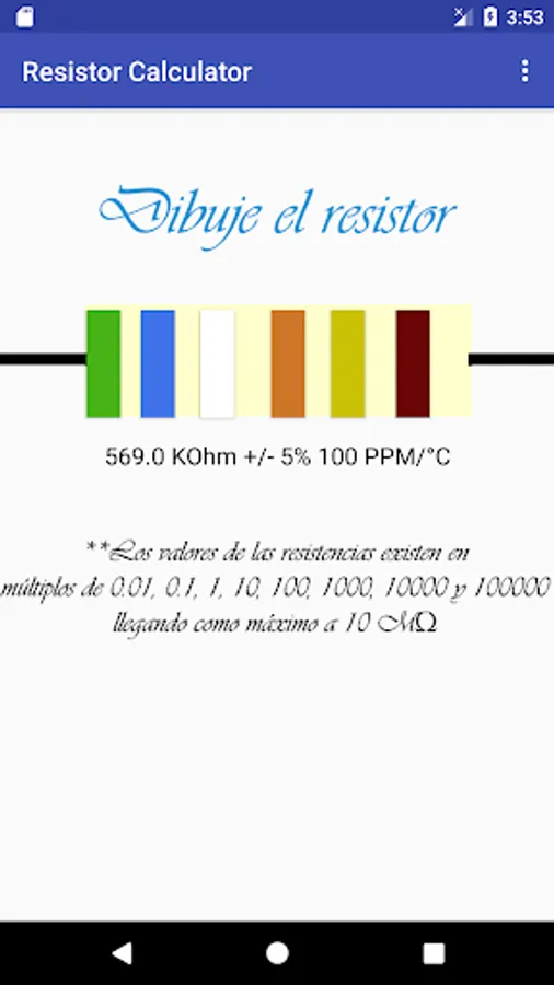 Draw the resistor and obtain its values easily, it is an ideal application for students and teachers of subjects related to electronics as it can help the learning process of the color code of 4, 5 and 6 band resistors.