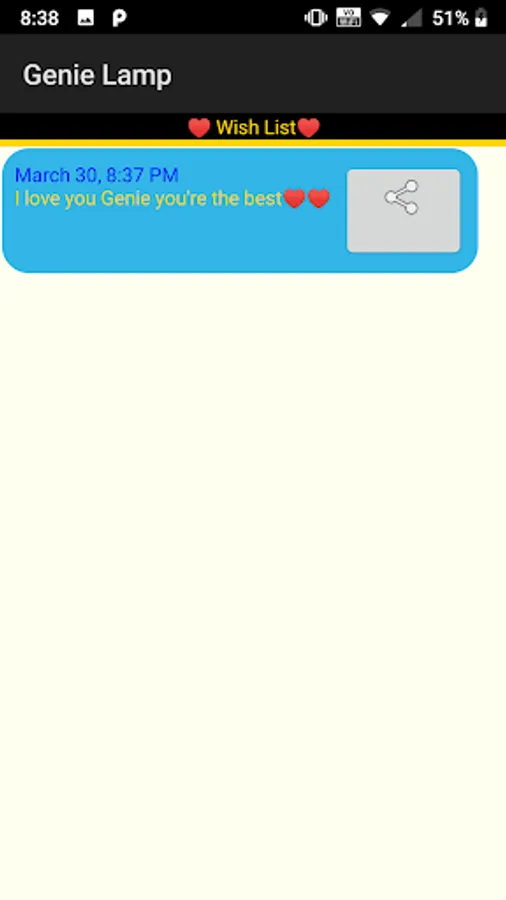 Making a wish to a genie is so much fun, in this app Genie Lamp the genie will prompt you to make a wish and give you a reply based on your wish, also there will be a list kept of all of the wishes that you ever made, so be careful what you wish for. The app uses sound recognition so your really saying your wish to the genie. Wishes are not guaranteed to come true, for entertainment purposes only, Enjoy!!!!!