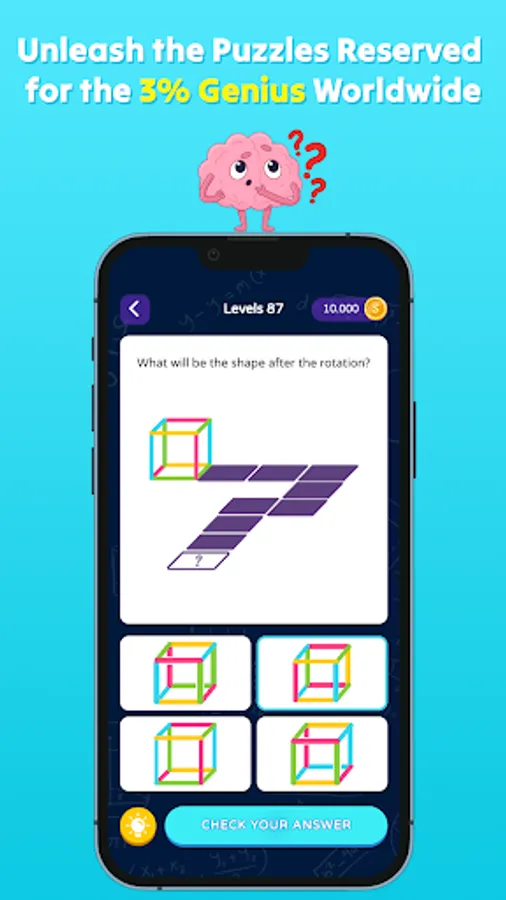 Brain IQ - Math Puzzle With Answers is a free educational game that offers a wide range of math riddles, logical puzzles, IQ tests, brain games, and geometrical shapes that are suitable for adults and kids. This game has cognitive riddles that challenge your analytical thinking, logic skills, and perception abilities. It's a great way to develop brain cells, attention, and memory power, while also practicing stress control.