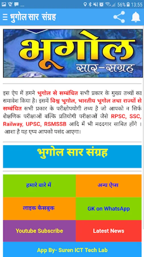 In this app we have included all types of main facts related to geography. It has all kinds of useful facts related to world geography, Indian geography and states, which will prove to be helpful not only in academic exams but also in competitive exams like RPSC, SSC, Railway, UPSC, RSMSSB etc. Hope you like this app.
