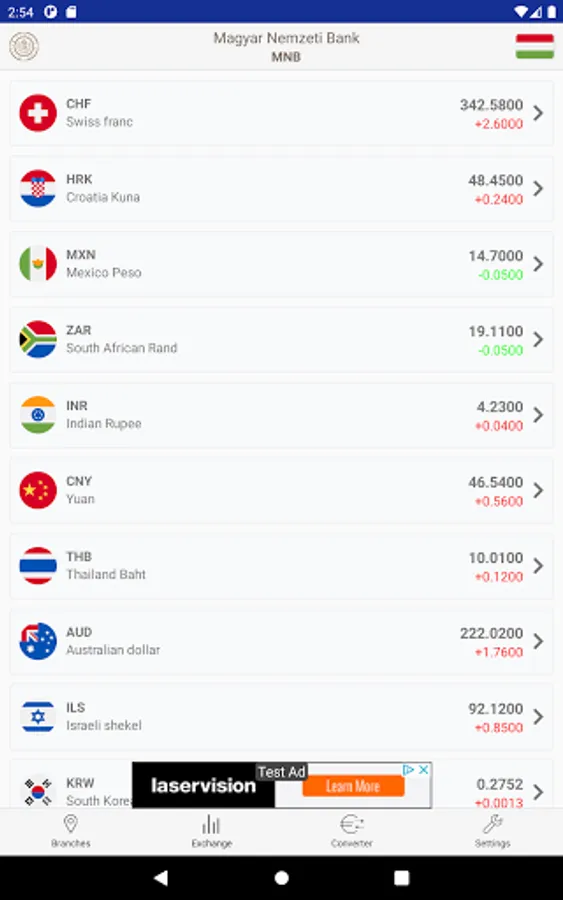 Over 50 currencies tracked, including: Euro, US Dollar, British Pound, Hungarian Forint, Swiss Franc, Polish Zloty, Bulgarian Lev, Canadian Dollar, Moldovan Leu, Turkish Lira, Australian Dollar, Swedish Krona, Danish Krone, Ruble Norwegian Yen, Czech Crown, etc.