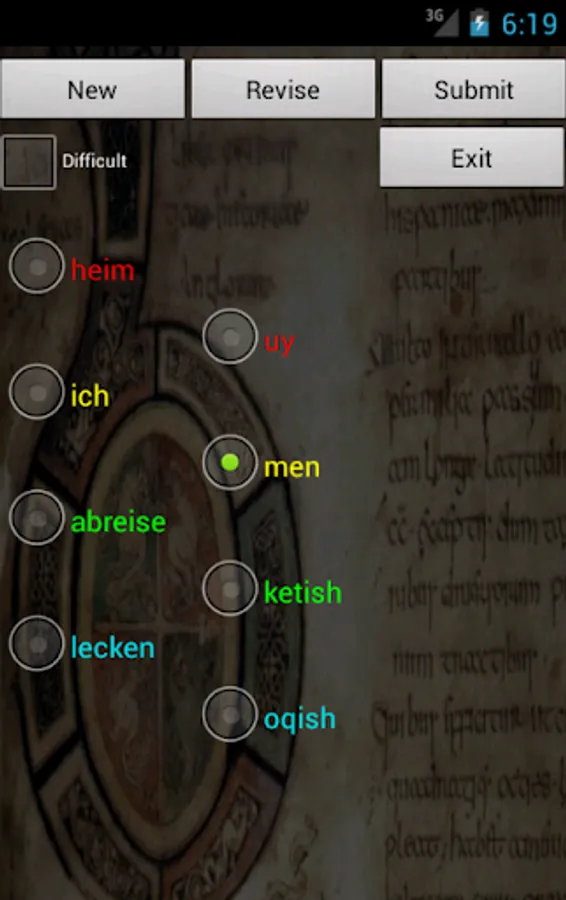 A. Select New, then touch the head word in the left column and it's matching word in the right column. Its colour will change. Repeat this for all words and then select Submit to check the answers