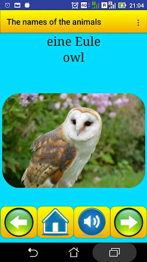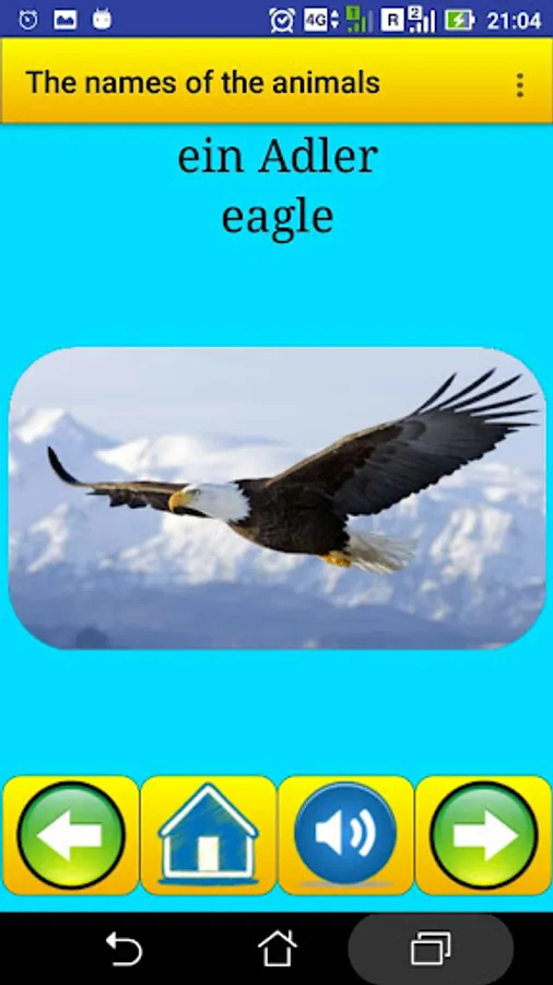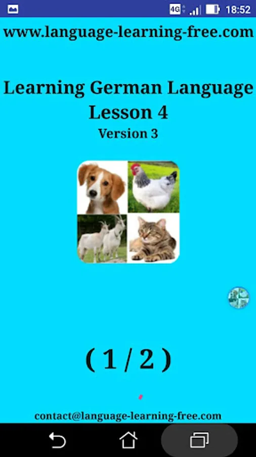 This is the fourth lesson from the serial of four lesson for learning German language , in this lesson you can learn the names of the animals in German language by sound , but you need to install (Google text to speech) for listening the sounds . There are 63 name in this lesson like the cow the horse , the donkey , the monkey and other fishes like the dolphin.