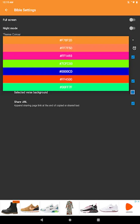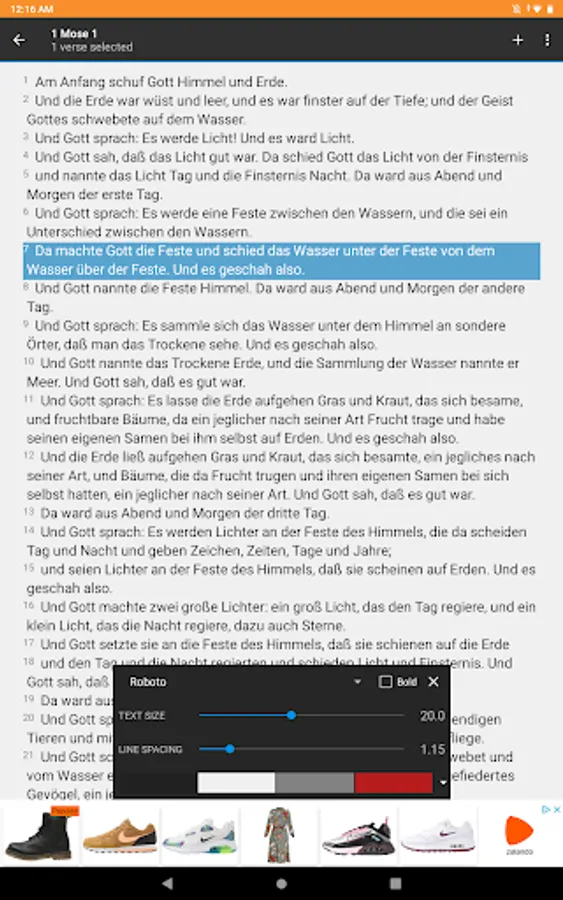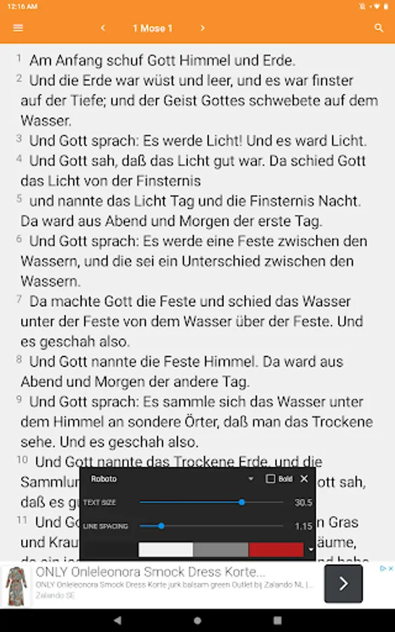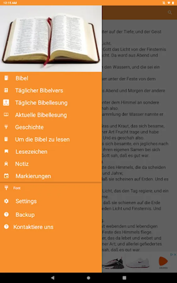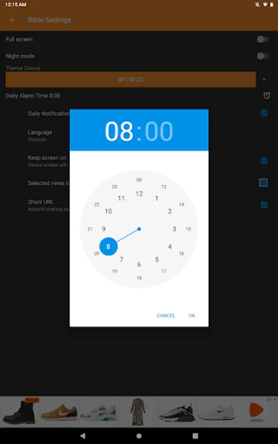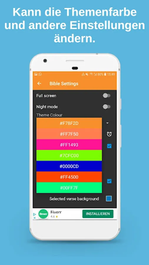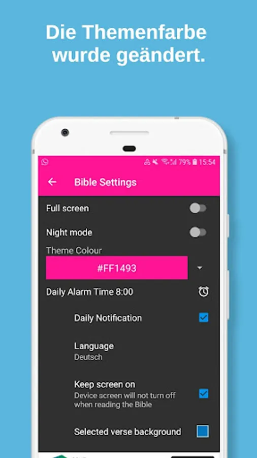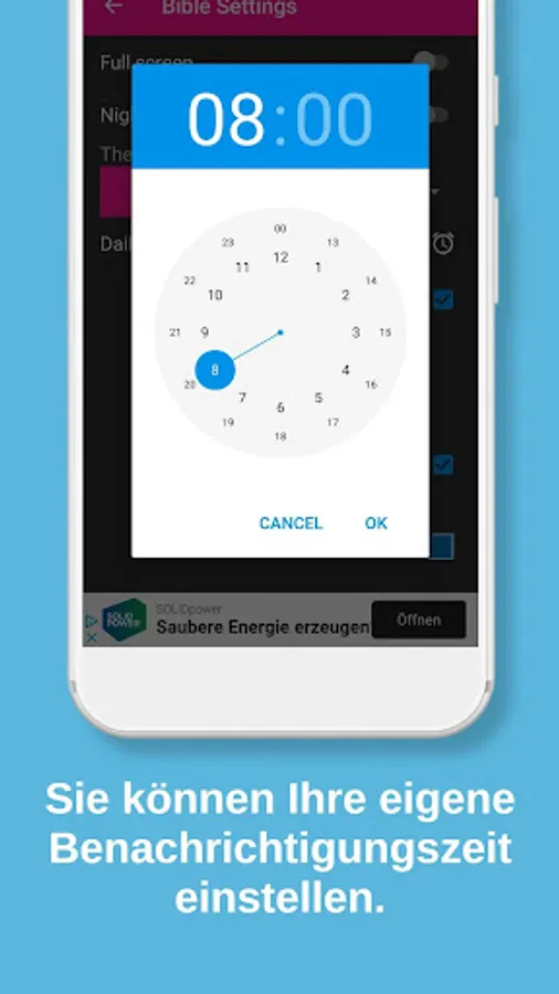 Auf den Einstellungen-Tab können Sie die Bibel-Anwendungsoberfläche auf viele verschiedene Weisen nach den individuellen Vorlieben ändern. Dazu gehören und sind auch nicht limitiert, die Themenfarbe; Tägliche Benachrichtigung; Tägliche Alarmzeit und viele andere.