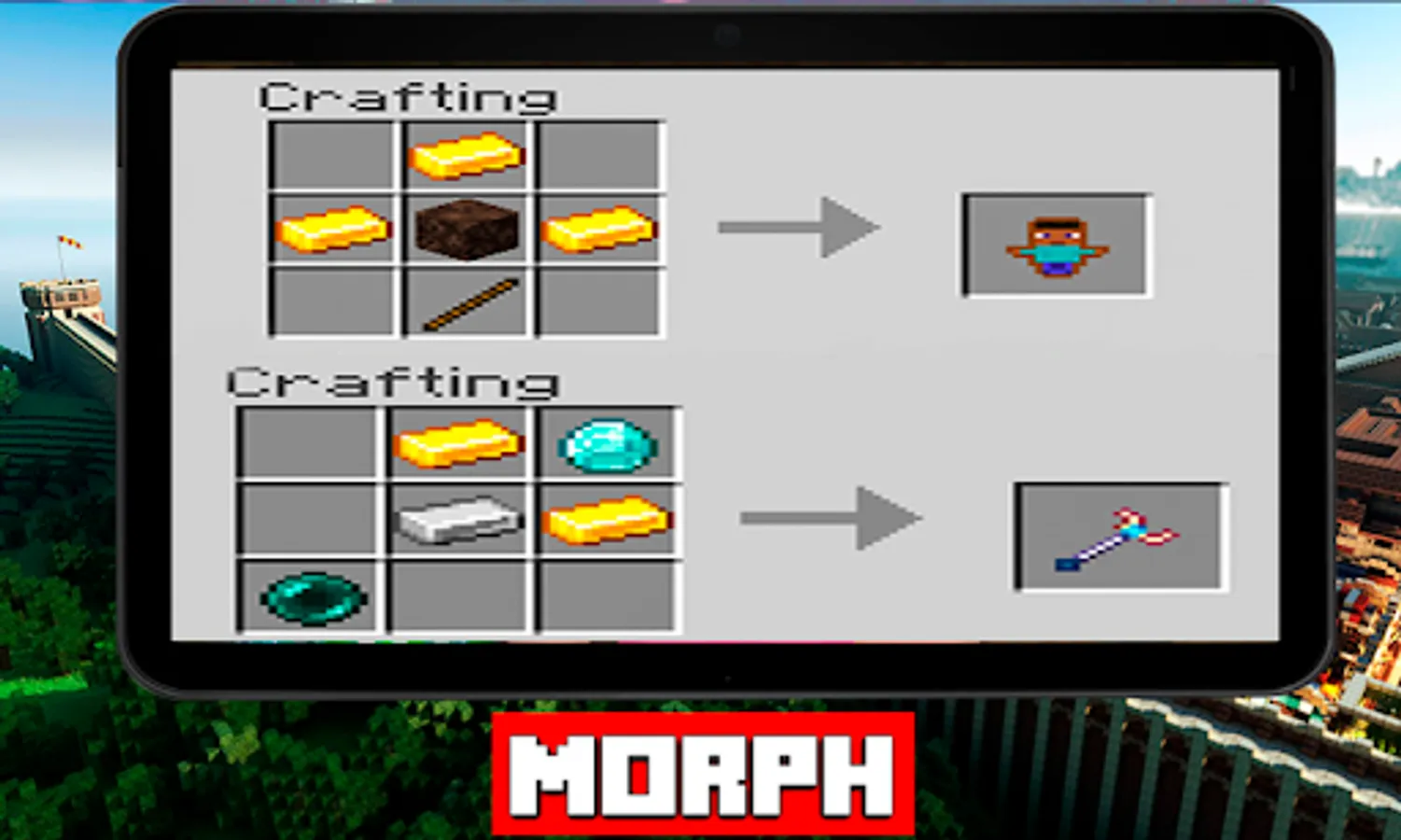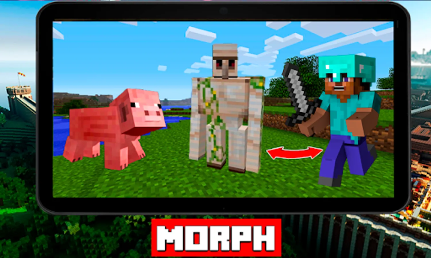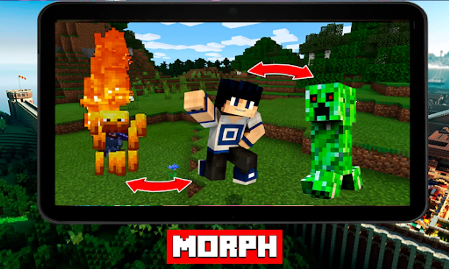 Mods Morph Plus adds the ability to the gamer, with this addons for minecraft, turn into one of the 25 mobs of your minecraft world. In these mods mcpe, the player doesn't just look like another mob. All these mobs give the player many of his abilities, but also new weaknesses.