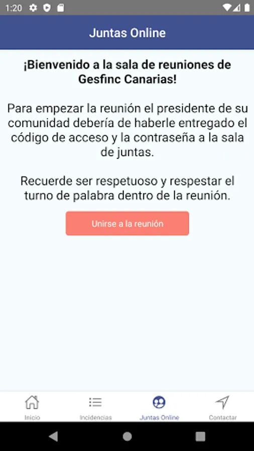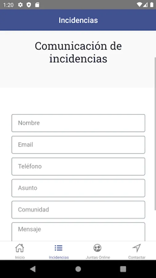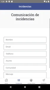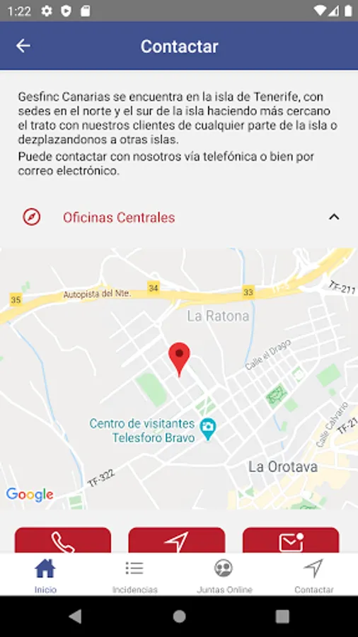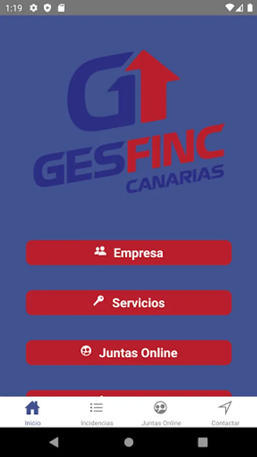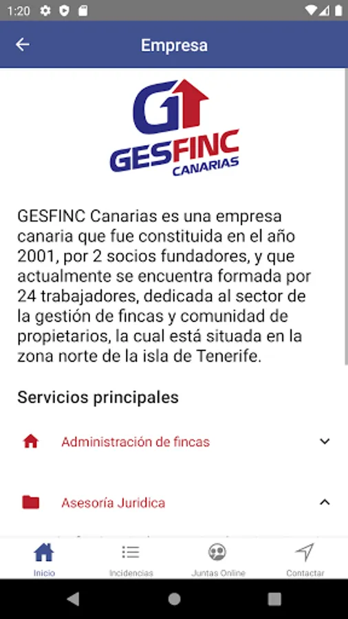 Communication app of the company Gesfinc Canarias S.L that allows the sending of incidents through a form to the Gesfinc Canarias incident support team, shows general information about the company and its contact details.