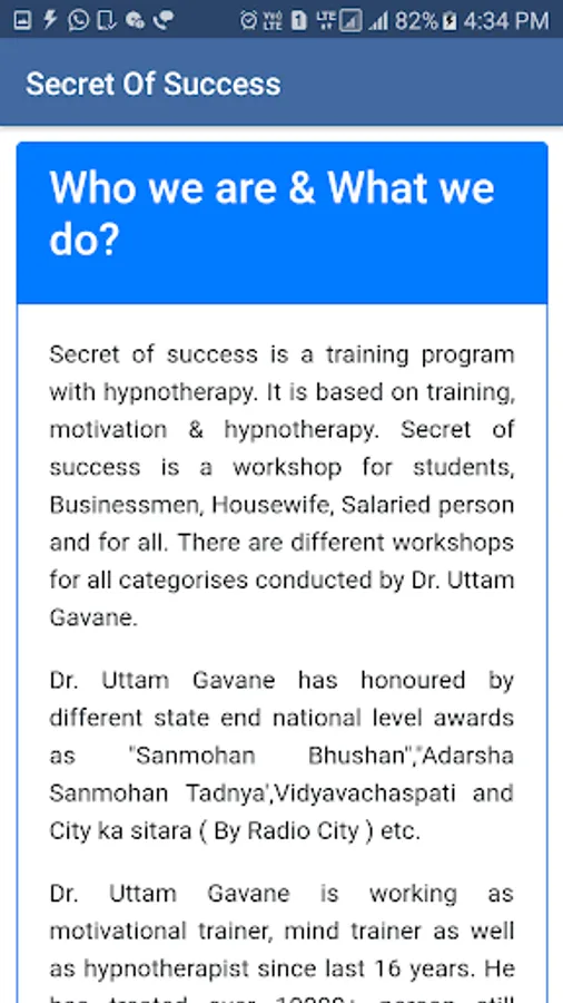 Dr. Uttam Gavane is working as motivational trainer, mind trainer as well as hypnotherapist since last 16 years. He has treated over 10000 person still today. The programs of Secret of Success are conducted all over the Maharashtra, they have published many articles in news paper. They also conduct the seminars and path showing programs for the corporate sectors and collages.