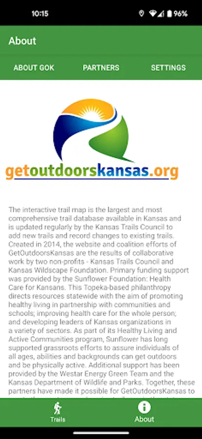 Download this custom app with no in-app purchases or subscriptions, created by Kansans for Kansans through the team effort of Kansas Wildscape Foundation and the Kansas Trails Council. Locate statewide trail without pop-ups or annoying ads. GetOutdoorsKansas is designed to be direct, stream-lined and easy to use.