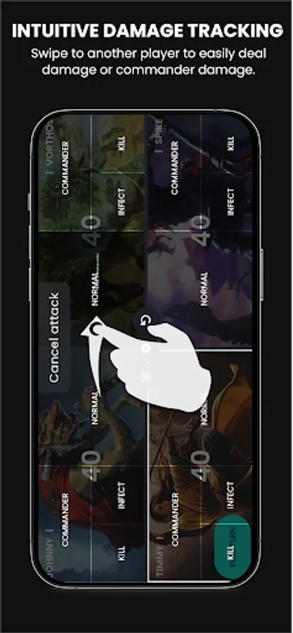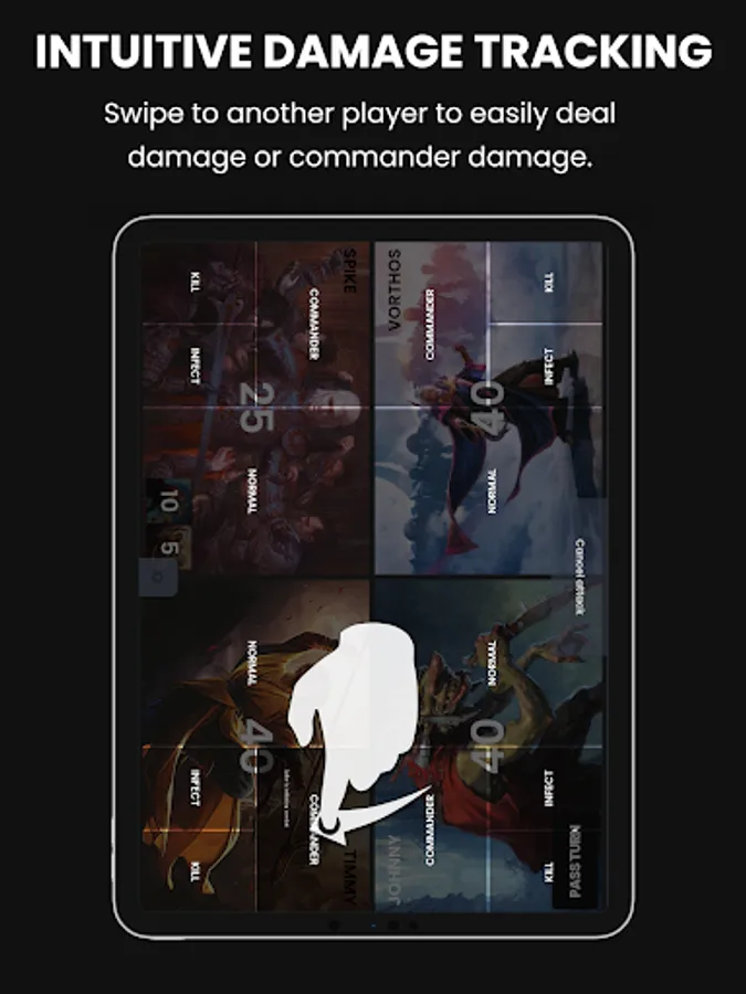 + Intuitive UI: By using a combination of swiping gestures (swipe towards the player that you want to damage) and tapping (tap for 1 life or hold for 10 life) tracking takes little effort.