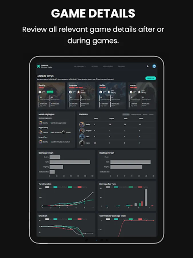 + Don't just track wins and losses, but track how much damage has been done by which player and to which player, track turn duration and of course commander damage and poison counters.