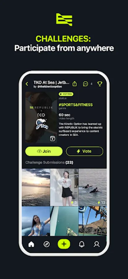 Gamified Challenges: Give a content creator a fair shot at discovery and let the community determine virality. Hold viral challenges on our social media platform, compete, and vote on the outcome. RepubliK is the only platform where you, as a creator, can join broad, short-form video challenges and earn rewards for your efforts.