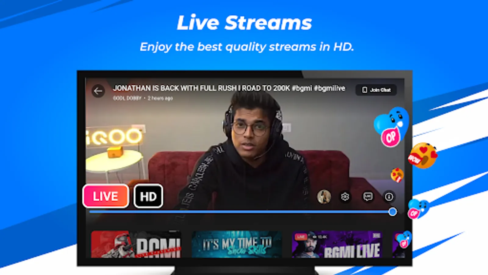 Stream your favorite games like Among Us, Battlegrounds Mobile India BGMI, PUBG Mobile, Call of Duty Mobile CODM, PUBG New state, Free Fire, Fortnite, Brawl Stars, Clash of Clans, eFootball, Mobile Legends, Clash Royale, FIFA, GTA, etc.