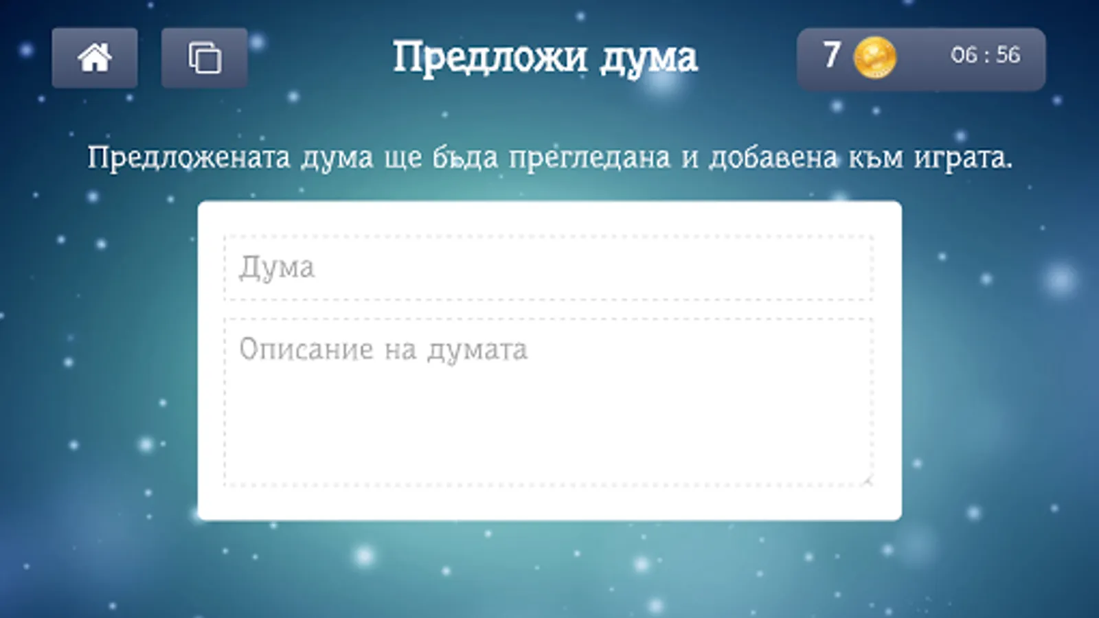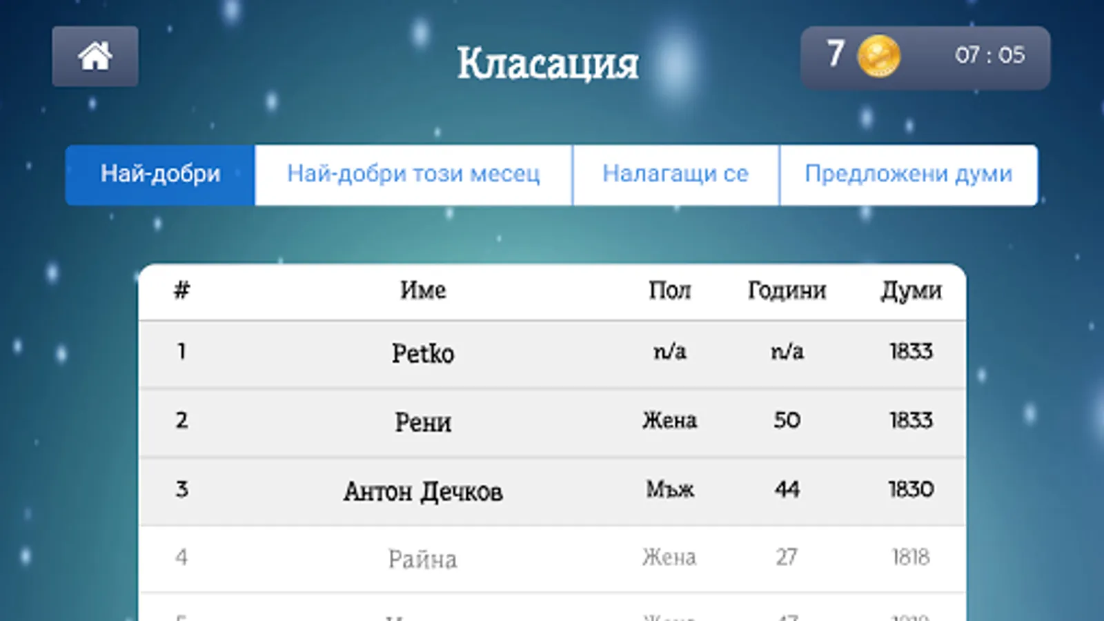 Ranking of the best players requiring players in recent weeks and rating for words added by users. Offer words and they will be displayed in the game in the new category "Proposed words." Any approved word will be displayed.