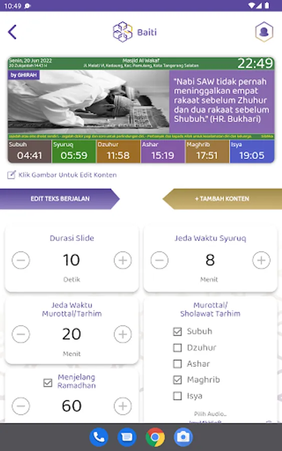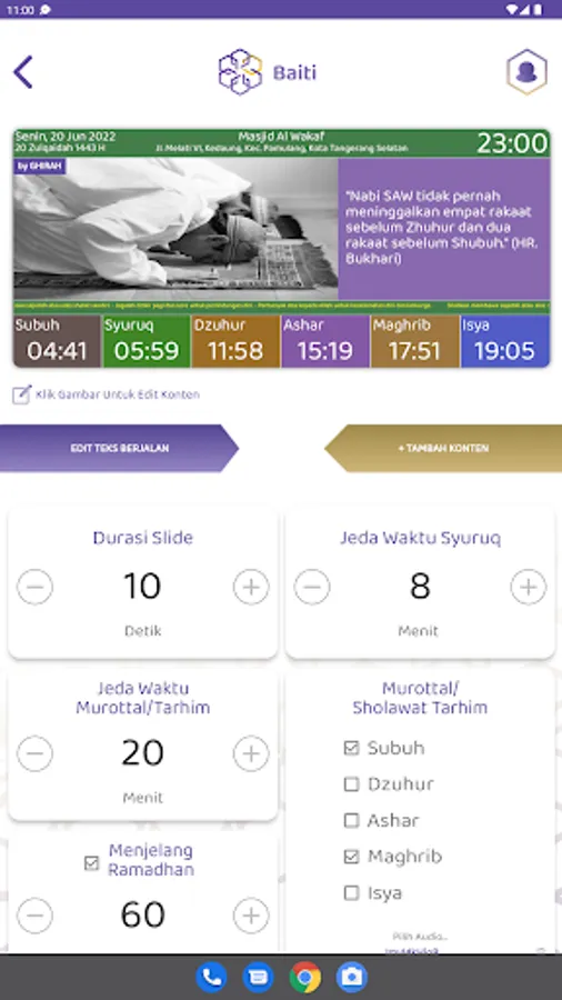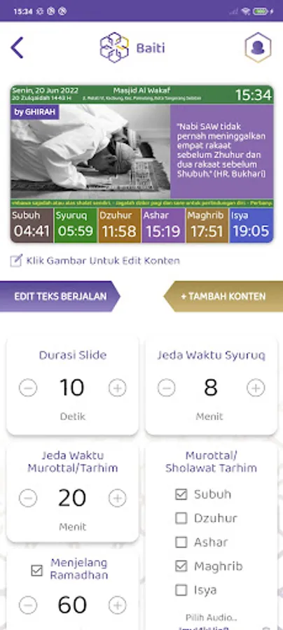 TV Settings: Displays information such as prayer schedules, iqamah breaks, activity banners, financial reports, activity schedules in the form of text, images and videos.