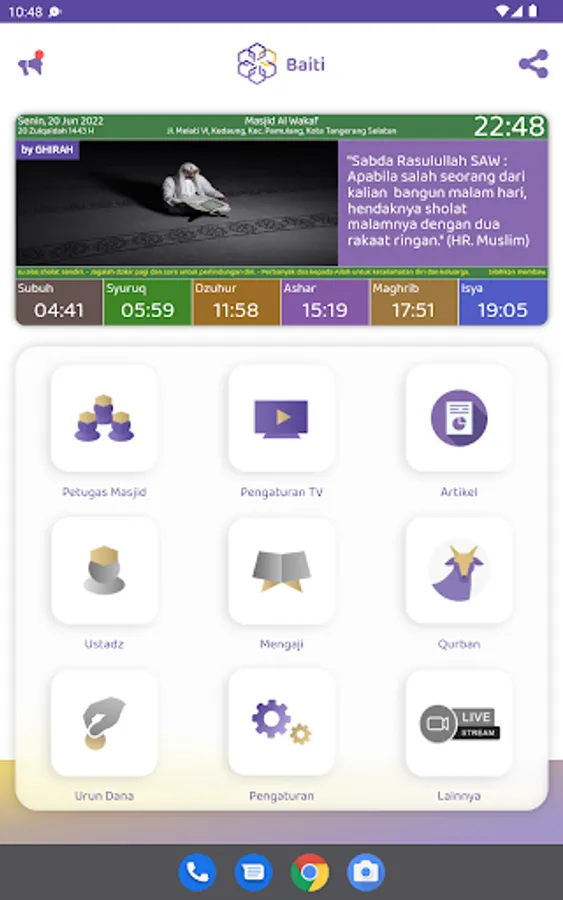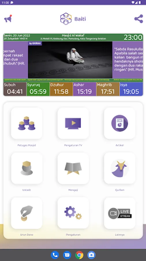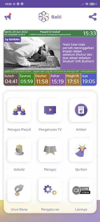 Make it easy for mosque/DKM administrators to manage and broadcast information effectively through mosque TV displays. By using BAITI, prayer schedules, iqamah and syuruq times are accurate/realtime, prayer services in mosques can be displayed easily and precisely. The administrators can easily disseminate announcements and other information via the mosque administrator's cell phone/DKM to be displayed on the mosque's TV and sent to the congregation's cellphone through the GHIRAH application.