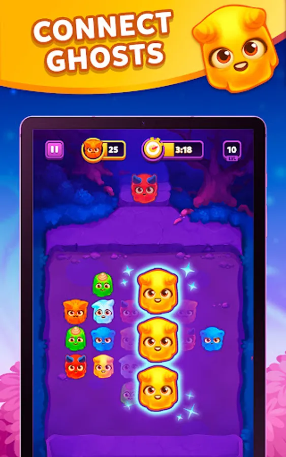 When you manage to place 3 or more same-colored ghosts nearby, they will be released and immediately leave the field. But the connect game continues: those ghosts that stood 1 cell above will take all free places below.