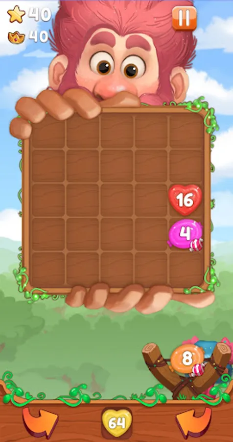 Help our cute fairy feed the cute giant with yummy candies. Here is the slingshot to aim and release the candies. Hit the matching cadies to merge and generate the next numbers. All you have to do is to create huge combos by merging more than one candy. Watch out, Blocks will be adding on the boars which can make it difficult to reach the matching candies. You can smash the blocks by merging candies